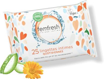 * Le pH de la zone intime est différent de celui du reste du corps. Les lingettes Femfresh sont proches du pH naturel de la zone intime pour aider à maintenir l’équilibre naturel du microbiome de la peau